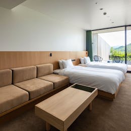 まるで別荘のような一棟独立タイプの露天風呂付ヴィラ6棟と、山の斜面に建つテラス付き客室など5タイプ全155室のホテル棟からなり、どちらも大自然を望む癒しの空間となっています。愛犬と泊まれるお部屋もあるのでワンちゃん連れの方にもおすすめです♡