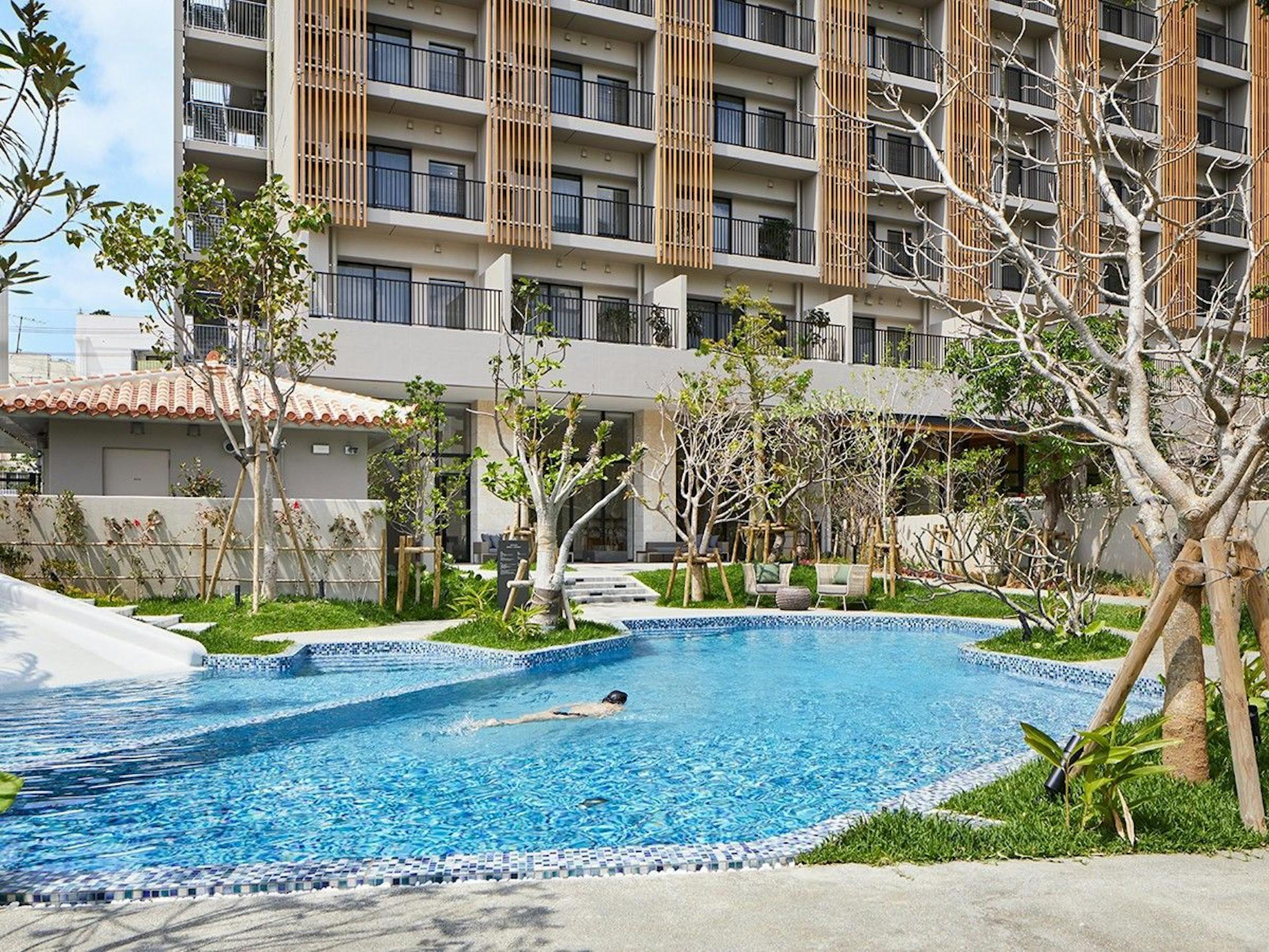 市街地にいながらも沖縄らしいリゾート感が楽しめる中庭には全長14mの屋外プールがあり、なんと宿泊者は無料で利用可能♪