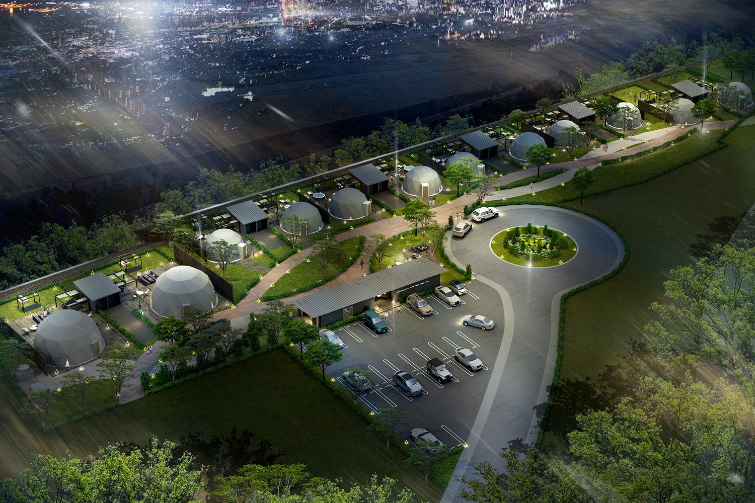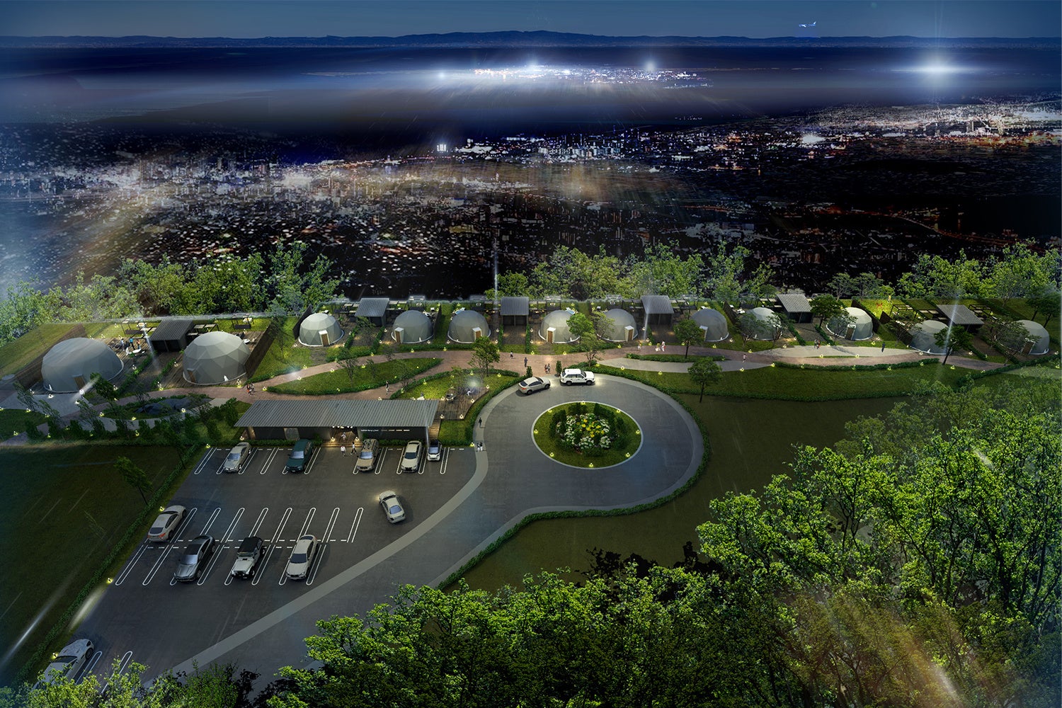 大阪府南西部、泉州エリア随一の夜景の穴場とされている大阪府阪南市の阪南スカイタウン展望緑地に全12棟と多数の大型ドームテントを配置した大阪府初のグランピング施設が誕生します。